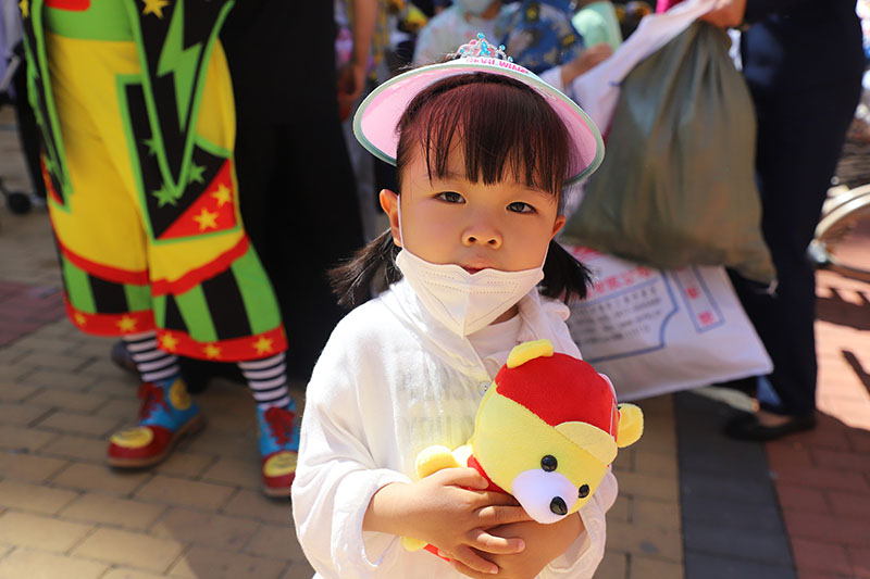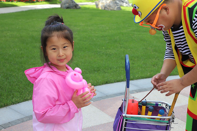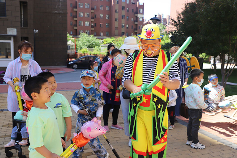 在小區(qū)內(nèi),天格物業(yè)的員工化身小丑。親手為每一位小朋友送上兒童節(jié)禮品,并送上祝?!白K行∨笥压?jié)日快樂”